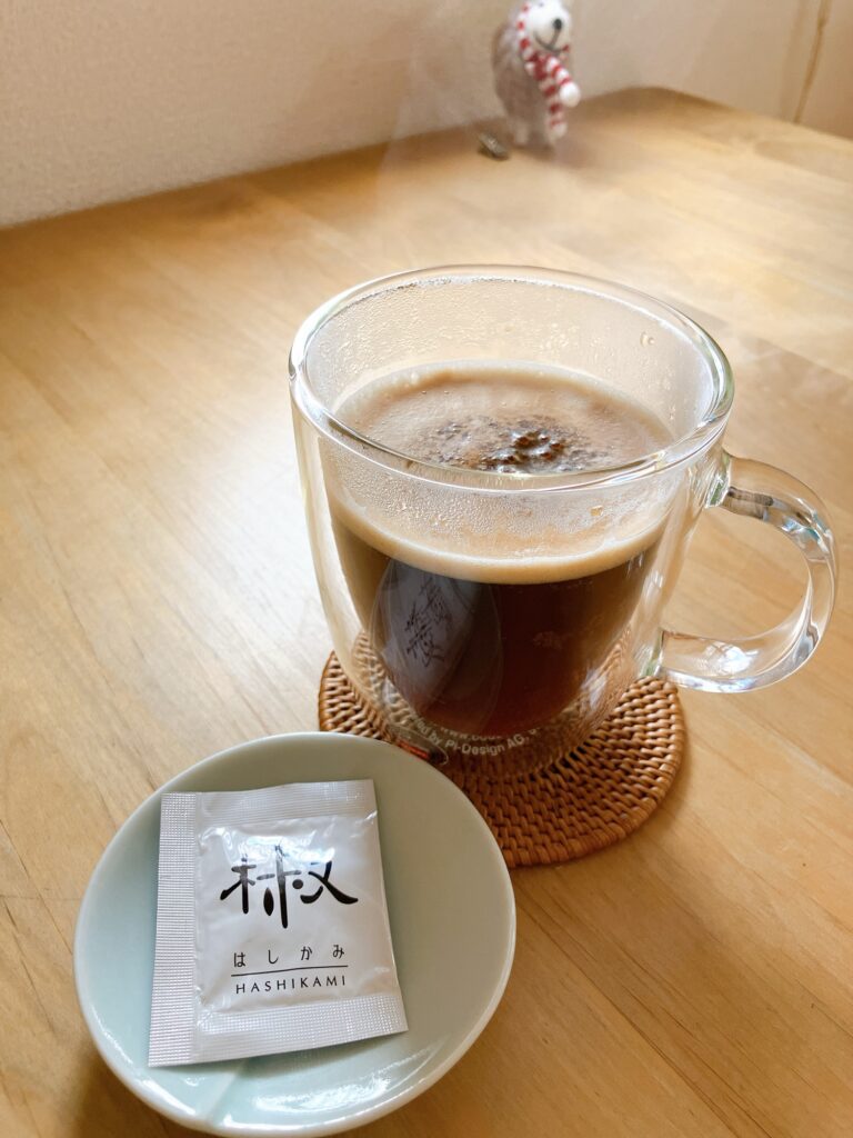 朝のコーヒーは、濃いめのカフェインたっぷりのコーヒーが飲みたくなるため、少しでもからだを冷やさないように考えた、自分なりのアイデア!