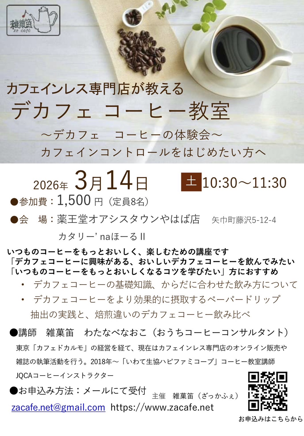 カフェインレス、美味しいコーヒーなどに興味あるかたなど是非、ご参加くださいませ。